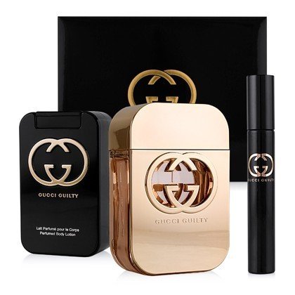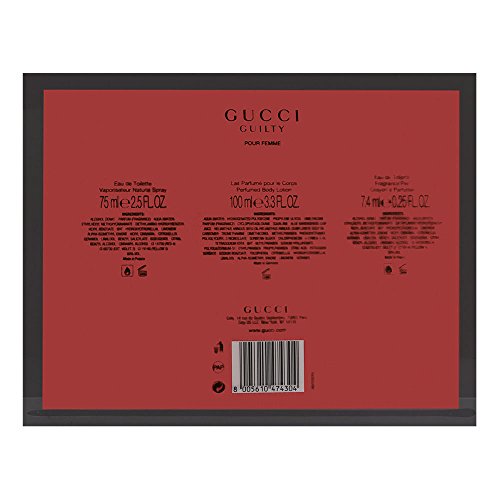 Product Description Gucci Guilty by Gucci for Women 3 Piece Set Includes: 2.5 oz Eau de Toilette Spray 3.3 oz Perfumed Body Lotion 0.25 oz Eau de Toilette Fragrance Pen Spray 0