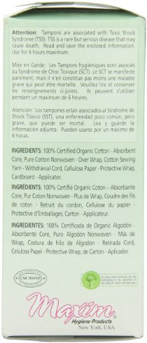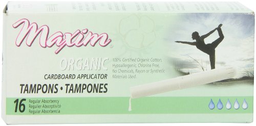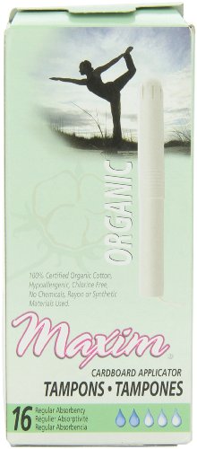 ReleaseDate : 2012-09-21 Studio : Maxim Hygiene Products, Inc. Publisher : Maxim Hygiene Products, Inc. Binding : Health and Beauty Product Description What looks like Cotton in other tampons is not always 100% Cotton. Maxim Applicator Tampons are made with 100% Certified Organic and Chlorine Free cotton which makes them reduce the risk of irritation, minimize the body's exposure to chemicals, feel softer, and better for the environment. Look and work just like your average tampons, but Maxim tampons are made with only 100% Certified Organic Chlorine Free Cotton, which means no added pesticides, dyes, fragrances, rayon, viscose or harmful chemicals that can pollute your body and our earth. With the vagina being one of the most highly absorbent parts of a woman's body, wouldn't you want to make sure the tampons sitting inside of it for 4 - 6 hours are as clean and chemical free as possible? Choose Maxim and you can flow worry free! Maxim tampons protect better against the occurrence of tampon shredding that can happen inside of the body, making women even more susceptible to possible chemicals found in other brands. 0
