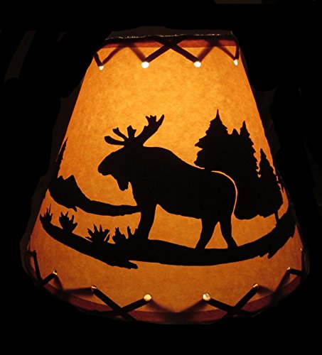 Product Description Faux oiled kraft laced lamp shade with lacing top and bottom with regular brass-plated clip-on that attaches to standard bulb. This rustic MOOSE lamp shade measures: 4" (top) x 9" (bottom) x 7" (slant). 0