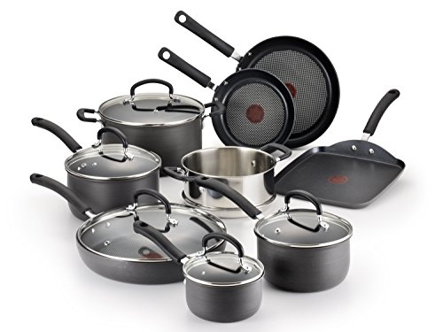 T-fal E918SE Ultimate Hard Anodized Durable Nonstick Expert Interior Thermo-Spot Heat Indicator Anti-Warp Base Dishwasher Safe PFOA Free Oven Safe Cookware Set, 14-Piece, Gray