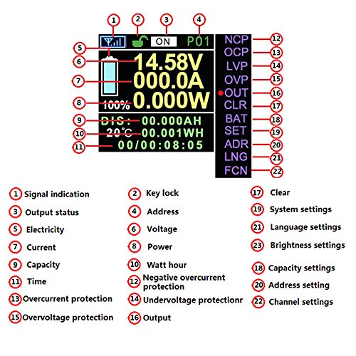 - The main parameters such as voltage and current are displayed in the large font interface for easy observation. After a few seconds, the main interface will automatically jump to the large font display interface, and the time can be set in the system settings. Reverse display interface easy to observe in the light, please read the "Operating Instructions” for details.