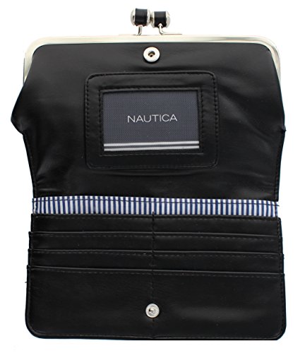 -. Binding : Apparel -. Brand : Nautica -. Department : womens -. Feature : • First large compartment with striped inner lining with Twist Snap Lock and metal keychain / • Second snap clip compartment includes one open pocket, 8 credit card slots and 1 ID window / • RFID Blocking Protection Will keep your identity Safe from Thieves that can scan your wallet -. ProductGroup : Apparel -. ProductTypeName : ACCESSORY -. Size : One Size -. Title : Nautica Le Mar Soft Frame Clutch Organizer With RFID