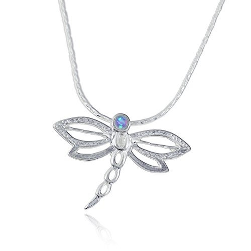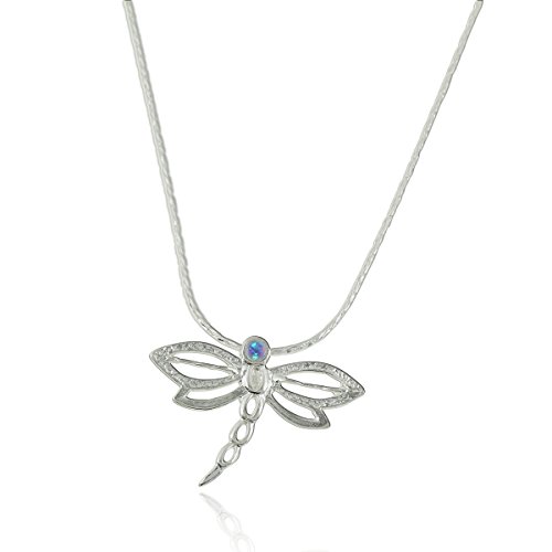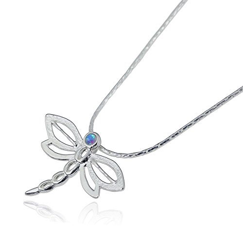 Graceful Sterling Silver dragonfly pendant necklace with 2 mm round cabochon created blue fire Opal. Artisan handmade.