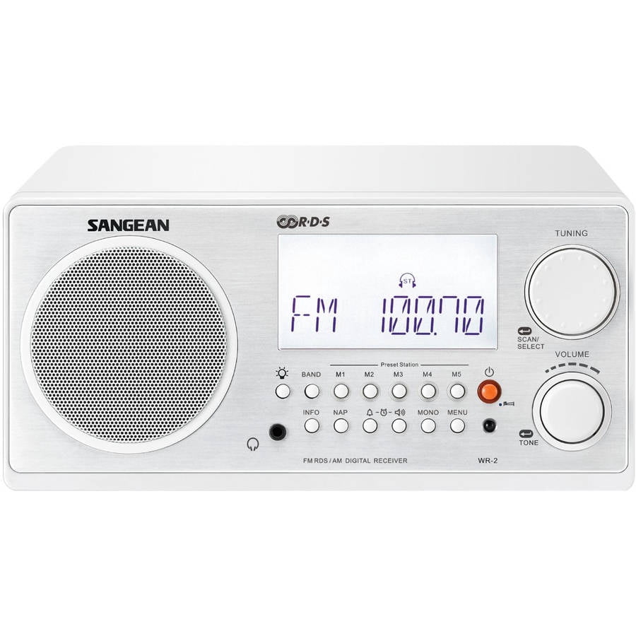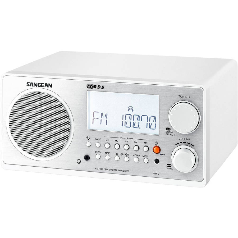 This fully featured Sangean Digital AM/FM Table Top Radio is an automatic setting digital clock with alarm system. This white Sangean Table Top Radio is a feature packed system that fits as well in your bedroom as it does your den. Your Sangean Digital Radio comes with a 3" 7-watt full-range speaker with enlarged magnet. Clock and alarm functions include a wake to radio or buzzer. With 10 AM/FM memory presets, this white Sangean Table Top Radio is the perfect musical companion whether youre relaxing in your bedroom or working around the house. The Sangean Digital AM/FM Table Top Radio can operate on a 9-14V DC power adapter (not included). Remote included.