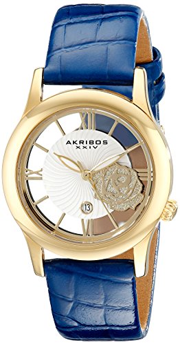 -. Title : Akribos XXIV Women's AK837BU Quartz Movement Watch with Yellow Gold and See Thru Flower Dial Featuring a Blue Leather Strap