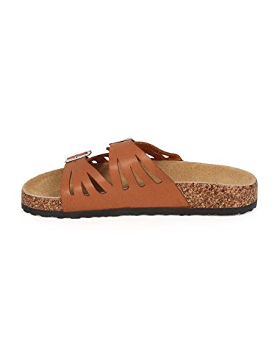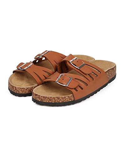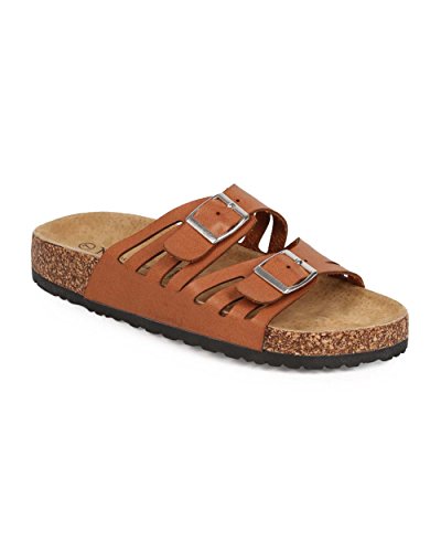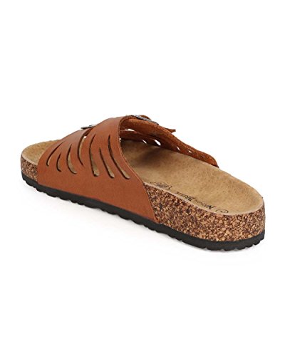 Nature Breeze EB65 Women Leatherette Open Toe Cutout Double Buckle Footbed Sandal - Tan