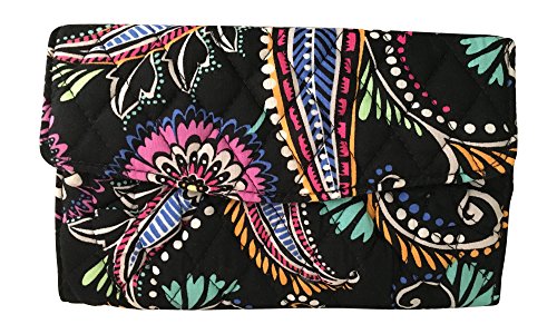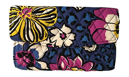 Wrapped in Vera Bradley's iconic print this strap wallet is a wallet and cross-body all in one! The magnetic snap closure secures an interior offering 12 card slots, a clear ID window and 3 full length bill compartments. The back offers a zippered pocket and a semi accordion zippered coin compartment. The removable strap offers a drop of about 23 inches. It measures approximately 7.5 inches (L) x 4.25 inches (H) x 1 inch (W). Patterns with solid color interiors are designed and manufactured for Vera Bradley Outlets.Feature