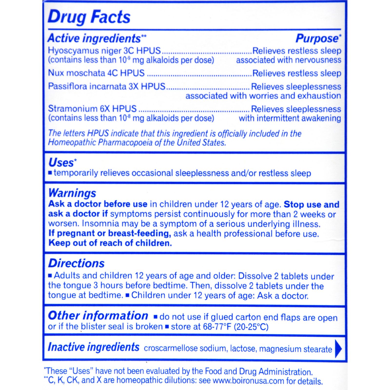 | USES:* Temporarily relieves occasional sleeplessness and/or restless sleep *These Uses have not been evaluated by the Food and Drug Administration. Ingredients : Active Ingredients:** Hyoscyamus niger 3C HPUS (contains less than 10-9 mg alkaloids per dose) - Relieves restless sleep associated with nervousness Nux moschata 4C HPUS - Relieves restless sleep Passiflora incarnata 3X HPUS - Relieves sleeplessness associated with worries and exhaustion Stramonium 6X HPUS (contains less than 10-8 mg alkaloids per dose) - Relieves sleeplessness with intermittent awakening The letters HPUS indicate that this ingredient is officially included in the Homeopathic Pharmacop ia of the United States. Inactive Ingredients: Croscarmellose sodium Lactose Magnesium stearate **C, K, CK, and X are homeopathic dilutions. Size : 60 TAB Pack of : 1 Product Selling Unit : each |