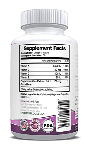 Vitamin A (as retinyl acetate) 5000 IU, Vitamin C (as ascorbic acid) 60mg, Vitamin D (as ergocalciferol) 400 IU, Vitamin E (as di-alpha-tocopheryl) 30 IU, Phytoceramides (From Rice) (providing glycolipids, phytoceramides & glycosylceramides) 40mg.