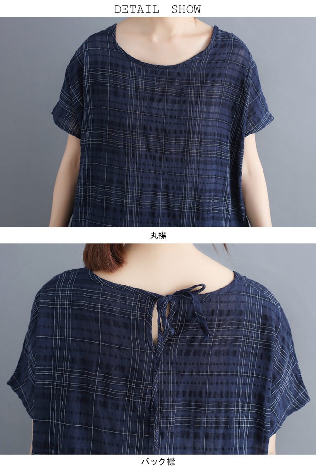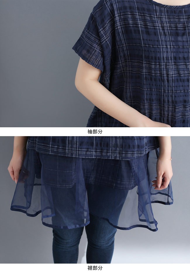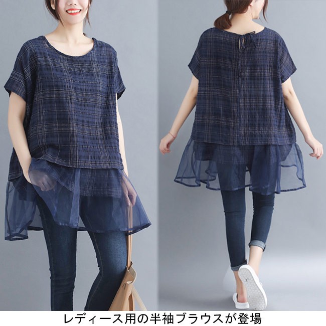 | 商品名 | レディース 半袖ブラウス チェック柄 ゆったり 丸襟 女性用 ブラウス 体型カバー 夏物 トップス チュール裾 カジュアル 大きいサイズ |