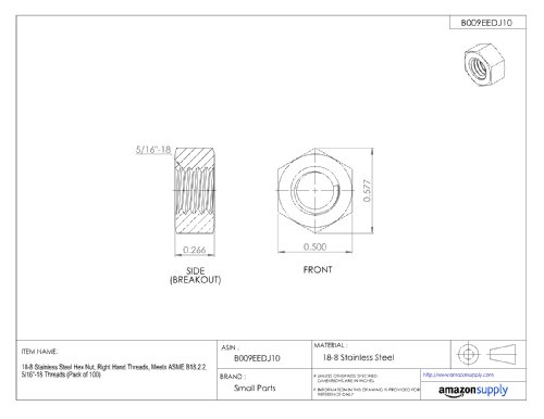 18-8 Stainless Steel Hex Nut, Plain Finish, ASME B18.2.2, 5/16"-18 Thread Size, 1/2" Width Across Flats, 17/64" Thick (Pack of 100)
