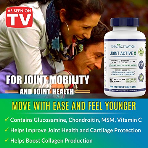 ARE YOUR JOINTS SHOWING SIGNS OF AGING? Try Joint ActiveX and feel the difference. Formulated to support joint health with the research-based benefits of MSM with biologically active sulfur, 1000mg Glucosamine, 100mg Chondroitin, Vitamin C, and 23 other collagen support and joint-lubricating ingredients.