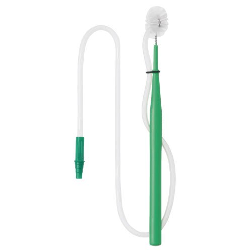 Size: Total length = about 200 mm, tube = 14 Fr Material: Brush = nylon, handle = polyethylene, tube = polyvinyl chloride