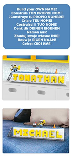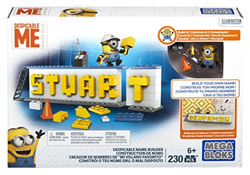 -. Binding : Toy -. Brand : Mega Bloks -. EAN : 0887961344806 -. Feature : Buildable nameplate with Minion-themed colors and accessories / Build up to eight letters long to spell out your name / Buildable Stuart Minion character with interchangeable parts including overalls, goggles, arms and feet / Includes helmet, red cone, ladder and other Minion-themed accessories / Connect with other Mega Bloks Despicable Me name builders to create even bigger words -. IsAdultProduct : 0 -. Label : Mattel -. Manufacturer : Mattel -. Model : DRV32 -. MPN : DRV32 -. PackageQuantity : 1 -. PartNumber : DRV32 -. ProductGroup : Toy -. ProductTypeName : TOYS_AND_GAMES -. Publisher : Mattel -. ReleaseDate : 2016-04-13 -. Studio : Mattel -. Title : Mega Bloks Despicable Me Name Builder Set -. UPC : 887961344806 -. Warranty : 1 year warranty against manufacturer defects