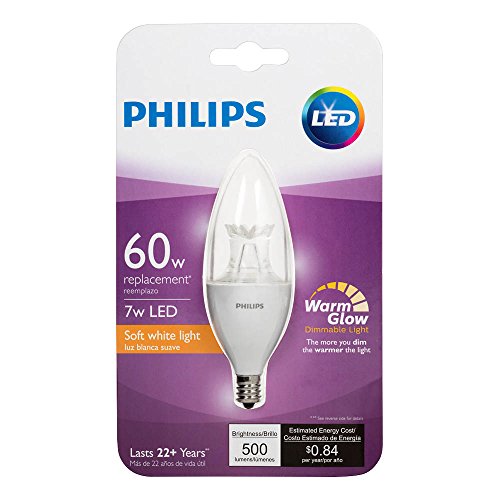 - Philips B12 Blunt-Tip 7W Decorative Candle LED light bulbs offer classic, made to be seen shape and provide 500 Lumen’s of soft white dimmable light, equivalent to 60-watt incandescents with 80% less energy use. These bulbs fit small candelabra (E12) fixtures.