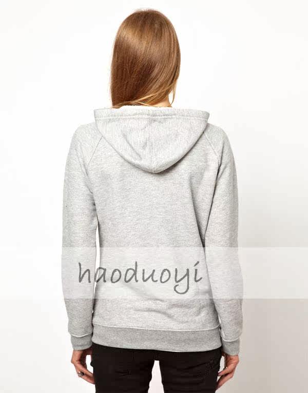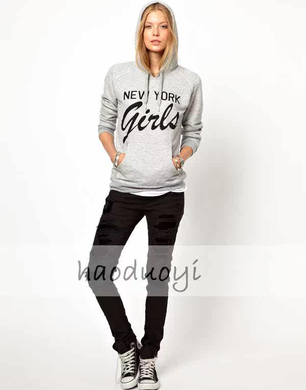 款名:haoduoyi New York Girls印花灰色带帽前口袋长袖卫衣