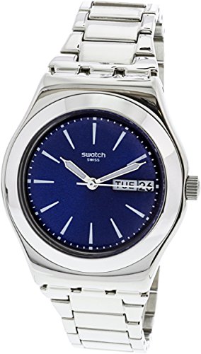 Stainless steel case with a stainless steel bracelet. Fixed stainless steel bezel. Blue dial with silver-tone hands and index hour markers. Minute markers around the outer rim. Dial Type: Analog. Luminescent hands and markers. Day of the week and date display at the 3 o'clock position. Quartz movement. Scratch resistant mineral crystal. Pull / push crown. Solid case back. Case diameter: 33 mm. Case thickness: 10 mm. Round case shape. Band width: 15 mm. Band length: 7.5 inches. Jewelry clasp. Water resistant at 30 meters / 100 feet. Functions: date, day, hour, minute, second. Casual watch style. Swatch Irony Blue Dial Stainless Steel Ladies Watch YLS713G.Feature