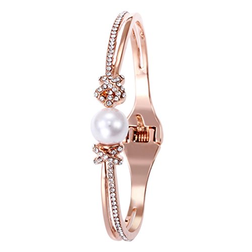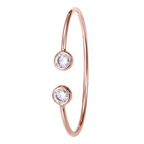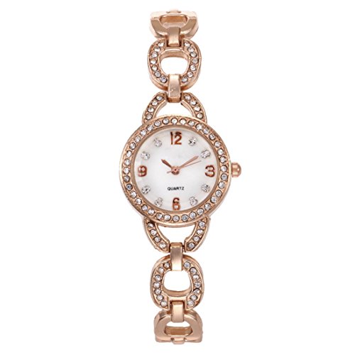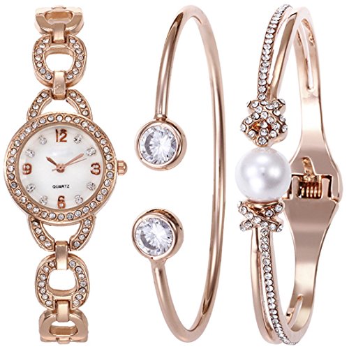 Souarts Women's Round Quartz Hollow Rhinestone Watch Simple Cuff Bangle Bracelet Jewelry Set Rose Gold Color White