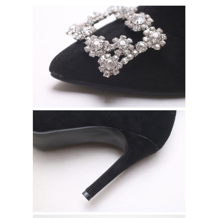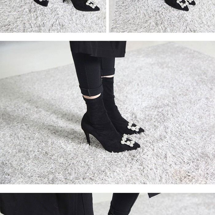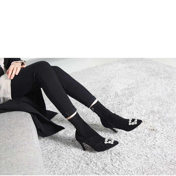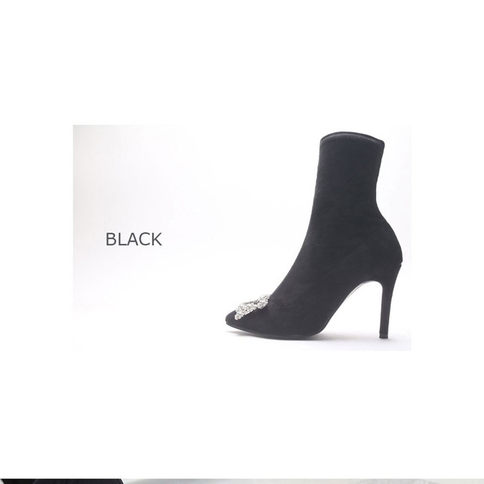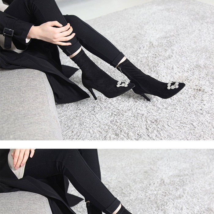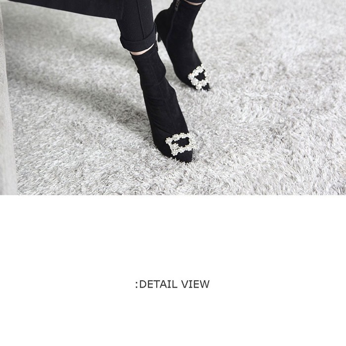 商品名:ストレッチブーツ レディース ピンヒール バックル ビジュー スエード調 2017 秋冬 ファッション 靴 婦人靴