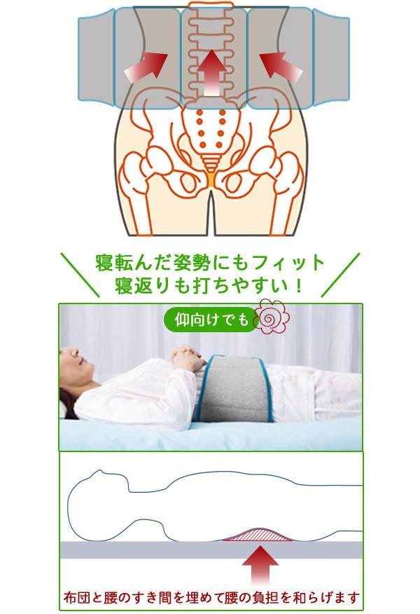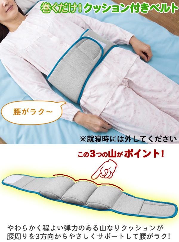 | やわらかく程よい弾力がある3つの山なりクッションが、3方向から腰回りを心地よくサポートしてラク!巻くだけのクッション付き腰ベルトです。面ファスナーで着脱や締め付け調節がカンタン。寝ころんだ時の床と腰のすき間を埋めて、腰の負担を和らげます。どんな寝姿にもフィットし、寝返りも打ちやすい。巻いたまま移動もできます。男女兼用。 |