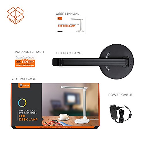 TaoTronics new generation energy-saving LED desk lamps comes with vision-friendly, low power Consumption LED light source, adjustable color modes, and Dimmable brightness settings, making them ideal for home and office use. Modern lighting say goodbye to your old incandescent light and faintly illuminated working space. Say Hello to this elegantly designed, modern looking and energy-efficient source of lighting for reading/working/studying. Vision care designed to blend naturally into any scene, and provide flicker-free and ghost-free lighting that is pleasant and comfortable for your eyes. Even after long hours of use, your eyes will feel less fatigue than with traditional types of lighting. Adjustable lighting with a slight touch from your finger tips, you can switch between a strong white light to soft yellow light. 5 different color temperatures and 7 brightness level for you to fine tune your illumination. Eco-friendly this new generation of eco-friendly LED lighting consumes 75Percent less power than traditional incandescent lights, while providing the same amount of light. This means a smaller electricity Bill and a smaller carbon footprint.Feature