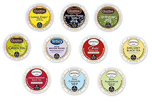 10 different flavors from Celestials, Twinnings and Tetley, 3 k cups per flavor
