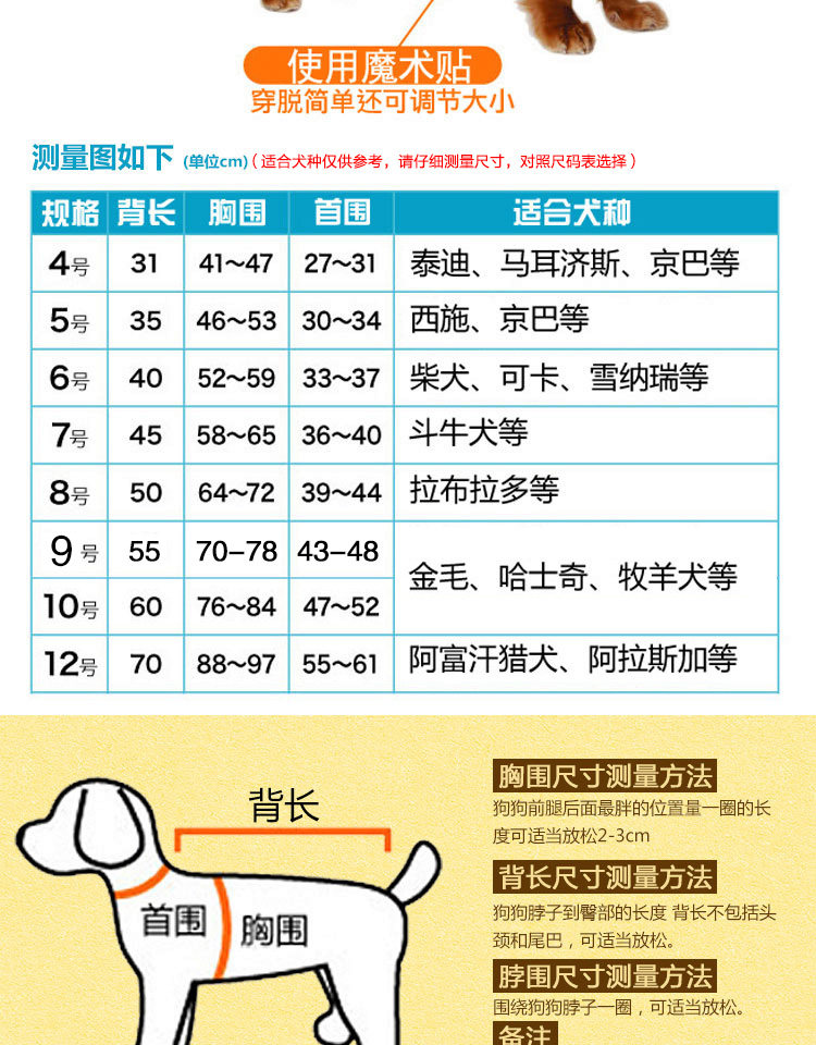 * 请严格按照上图仔细量下狗狗的背丈、胸围和颈围