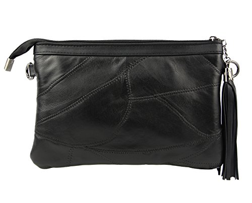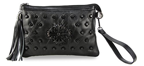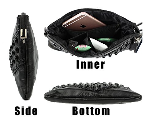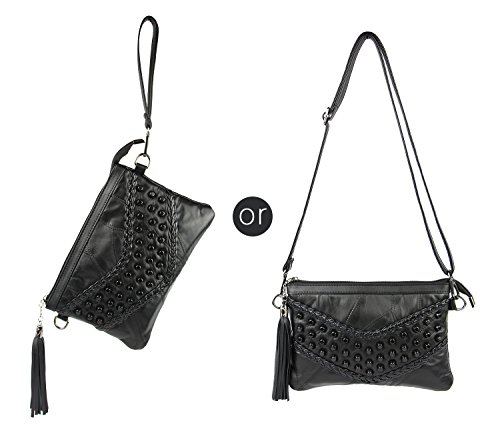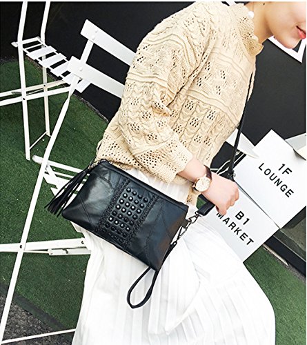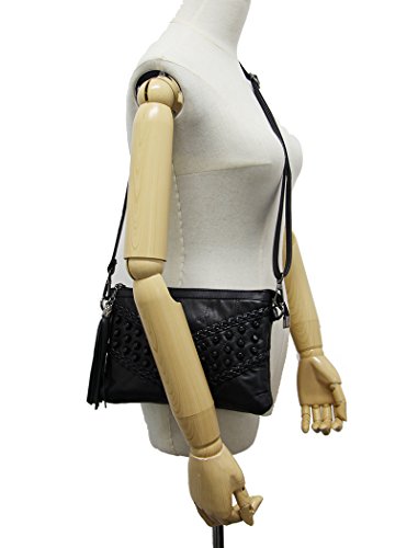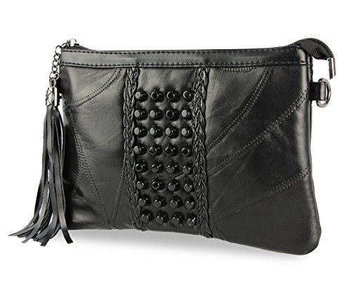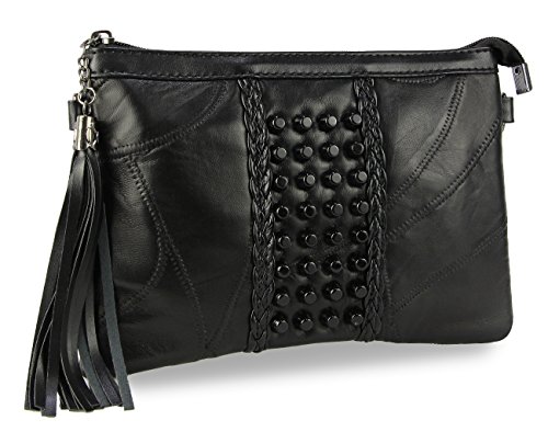 -. Feature : Size: 10.23 x 6.3 x 1.18 inches / Interior features 1 main compartment,1 zipper pocket and 2 slip pockets / It's a super fashion purse which decorated with punk rivets, tassel, irregular stitching and braid elements / Adjustable and detachable strap. You can have 3 carrying options: Shoulder Bag,Cross Body Bag,Clutch Handbag / Perfect to hold your wallets, iphones, keys, comsmetics or other daily stuffs