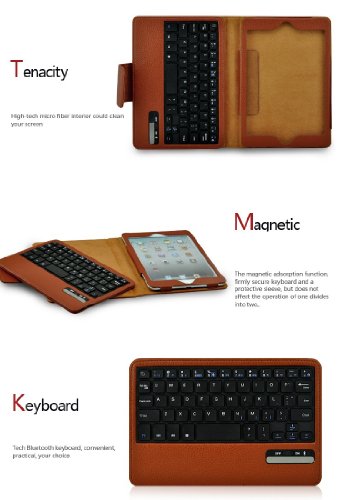 -. Feature : Compatible with iPad Mini 3 / 2 / 1, magnetic closure system secures, access to all ports and controlsG / Bluetooth 3.0 interface, Built-in Lithium Battery; Customized with sleep/wake hibernation mode when case is on the tablet; / High quality PU leather case provides a tight protection to every corner of your lovely iPad Mini from shocks, scratches and dust; / Real laptop style keys; ABS keyboard material; Detachable removable design hands-free viewing improving your typing experience;