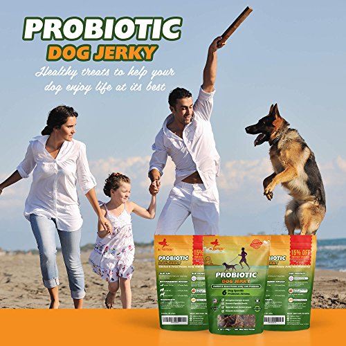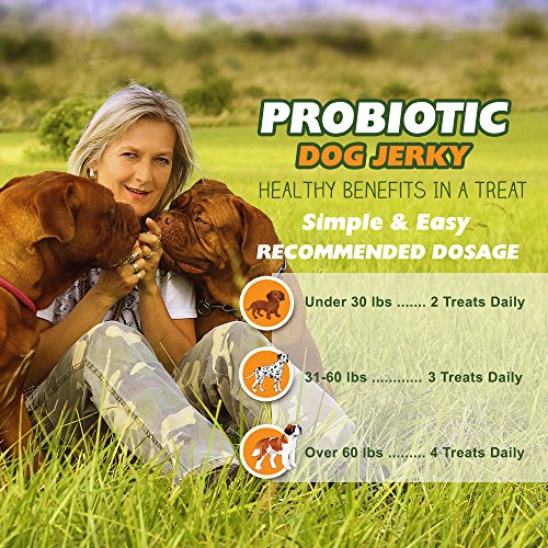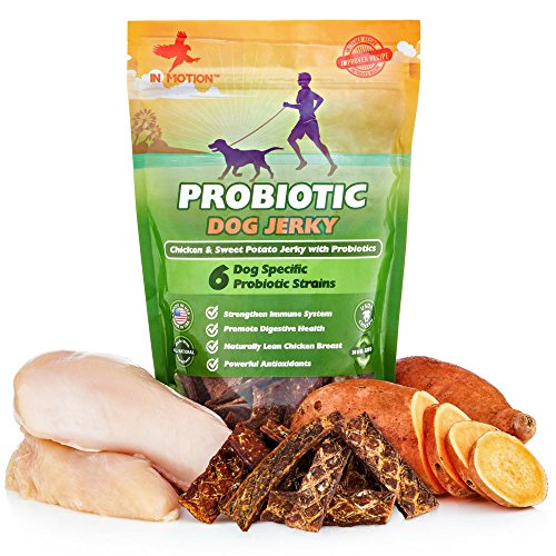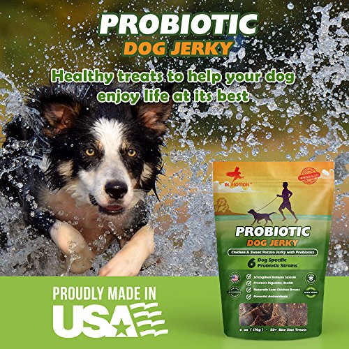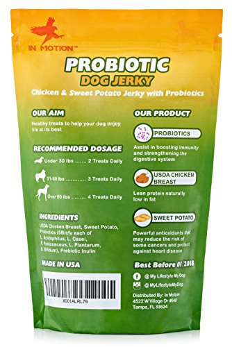 In Motion is proud to offer this delicious Probiotic Dog Jerky. Boost your dog's immune system and digestive system with this yummy treat, made with lean, low-fat USDA chicken, antioxidant-rich non-GMO sweet potato, and six strains of probiotic bacteria. HEALTHY DOG SNACKS: Our Chicken Jerky treats combine the health benefits of probiotics with lean protein and antioxidants from all natural non GMO sweet potato and USDA chicken breast. A healthy snack with probiotics to boot! Invest in your dog's wellbeing by bolstering her immune system and strengthening his digestive tract, so you can both enjoy life to its fullest. PROBIOTIC BOOST: Probiotics strengthen your dog's immune system and improve digestion, so your companion feels happy, healthy and up for anything. Plus with our Chicken Jerky, there's no need to use a powder supplement. MORE STRAINS THAN MOST BRANDS: With six unique strains of probiotic bacteria, each with 5 billion CFU, our Jerky is a powerful dosage of probiotics. By combining these powerful probiotics with a natural treat, we make it easy to add probiotics to your dog's diet while also eliminating the possibility of any allergic reaction, a risk that comes with more highly manufactured alternatives. MADE IN THE USA: Each and every one of our delicious dog treats is made right here at home with natural ingredients. Our recipe is human-grade, and we taste test our product! High quality standards are the key to our product's success. SATISFACTION GUARANTEE: Our goal is to provide beloved dogs with a healthy snack and probiotic solution that makes them feel great. If our product doesn't work for your pet, please get in touch, and we will issue a full and prompt refund. - Probiotic Chicken and Sweet Potato Jerky - 6oz or Approximately 50 Bite-Size Treats - 6 Strains of Probiotic Bacteria - Satisfaction GuaranteeFeature