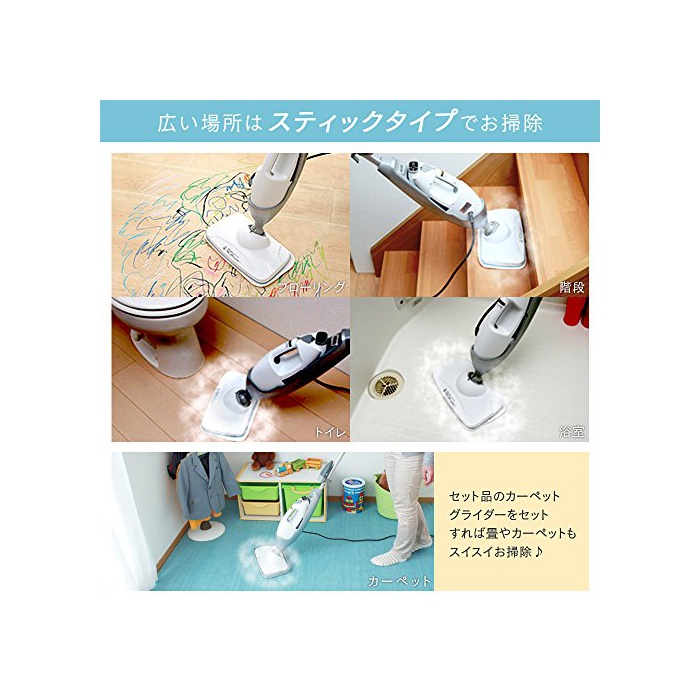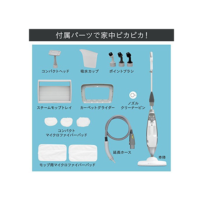 부속품:자루걸레용 마이크로 화이버(fiber) 패드2매,포용패드,카펫트 글라이더,steam 자루걸레 트레이,연장 호스,콤팩트용 마이크로 화이버(fiber)2매,노즐 클리너 핀,포인트 브러시3개,콤팩트 헤드,계량 컵