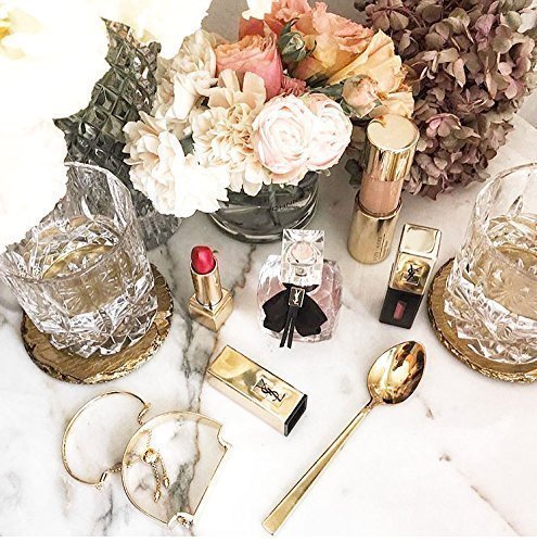 -. Title : Renee Redesigns Round Hand Painted Gold Slate Drink Coasters, Holiday Gift Set of 4 | Protects Table Surfaces | For Hot & Cold Beverages and Candles