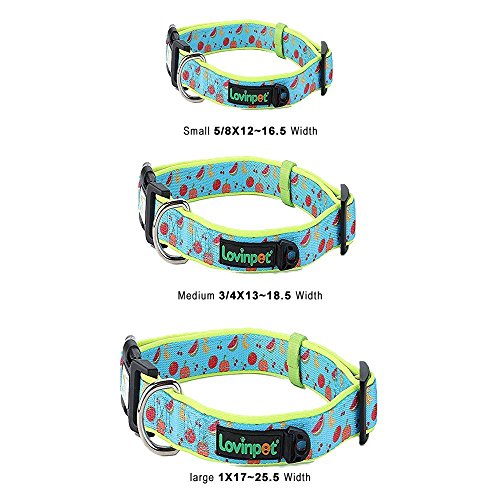 Studio : Lovinpet Publisher : Lovinpet Binding : Misc. Product Description Why choose our nylon pet collar? Featuring an adjustable buckle, it's quite easy to use. Not to mention, the dog-friendly print is absolutely adorable. Made out of neoprene, the collar is also soft but strong. The colors of the adjustable collar are also fun bright. The padded dog collar even makes a great doggy gift! Adjustable Pet Collar Sizing: Small Pet Collar = 5/8 x 12-16.5 inch Medium Pet Collar =3/4 x 13-18.5 inch Large Pet Collar = 1 x 17-25.5 inch Features: *Extra Durable Neoprene Material *Available in Small, Medium Large *Colors: Green/Rose Red/White/Yellow/Blue/Red Package Includes 1 LovinPet dog collar (S, M or L) Note This collar is a single product. However, it comes with matching leash/harness/safety seat belt to complete the look. Leash and harness sold separately. 0