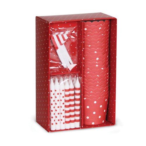 -. Feature : Red and white cupcake kit / Pack includes 24 baking cups, 12 cupcake toppers and 12 candles / Versatile for a variety of uses / Includes delicious cupcake recipe / Cups measure 1.75-Inches tall, candles measure 3-Inches tall and flags 2.375-Inches tall