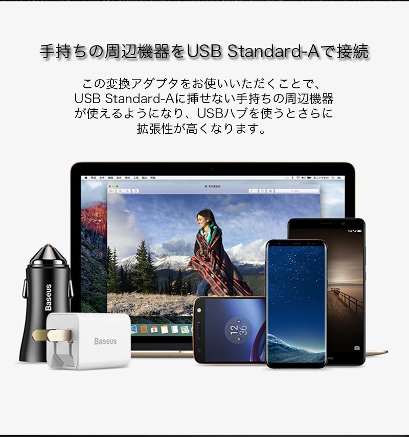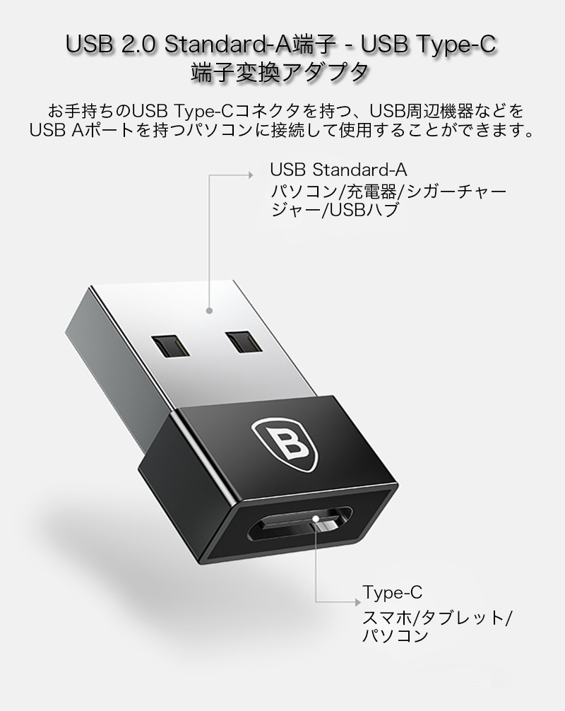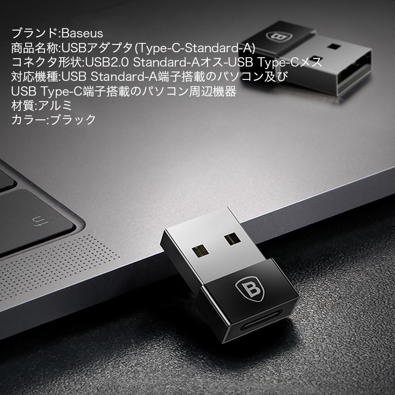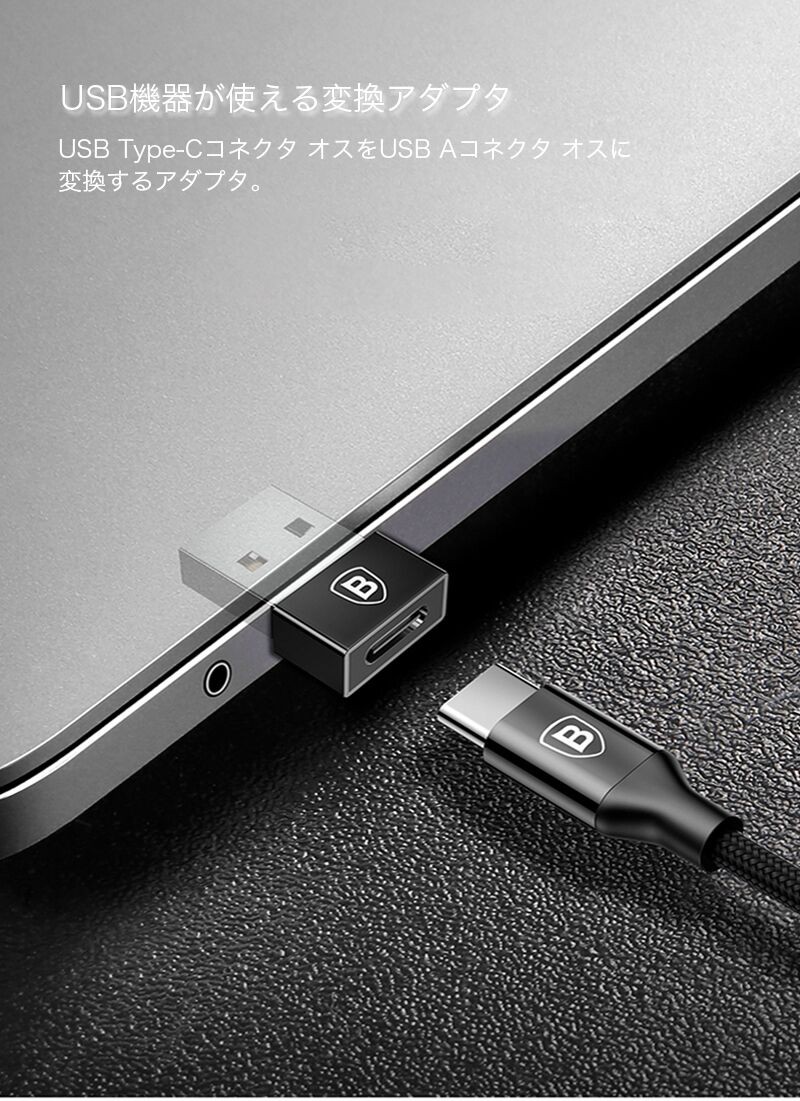 ★「対応機種」USB Standard-A端子搭載のパソコン及びUSB Type-C端子搭載のパソコン周辺機器★「カラー」ブラック(黒)★「商品特徴」USB Type-Cコネクタ オスをUSB Aコネクタ オスに変換するアダプタ。お手持ちのUSB Type-Cコネクタを持つ、USB周辺機器などをUSB Aポートを持つパソコンに接続して使用することができます。この変換アダプタをお使いいただくことで、USB Standard-Aに挿せない手持ちの周辺機器が使えるようになり、USBハブを使うとさらに拡張性が高くなります。★「キーワード」変換アダプタ USB Standard-Aオス USB Type-Cメス スマートフォン タブレット パソコン 充電器 シガーチャージャー USBハブ インストール不要 急速充電対応 充電 通信 データ転送 ブランド Baseus アルミ コンパクト
