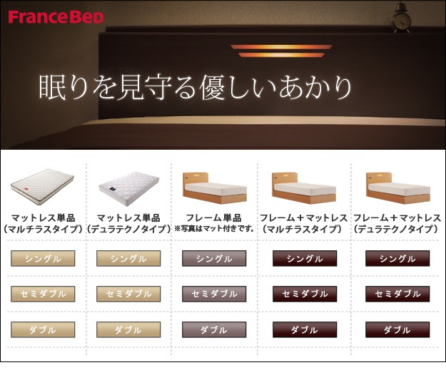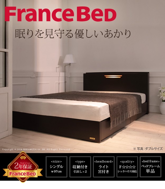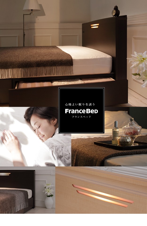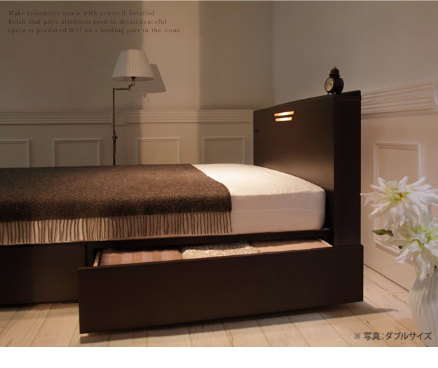 【宮付き・コンセント付き・照明付き、フラットヘッドボードのシンプルな引き出し収納付きベッド】ヘッドボードには文庫本や携帯などが置けて便利!シンプルなデザインで壁にぴったり寄せて使えます。2台並べて使用してもOK。引き出し付きでお部屋の収納力もアップ。