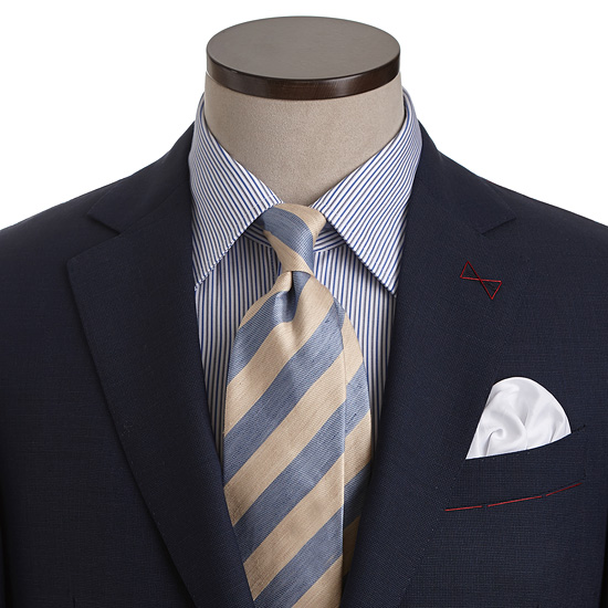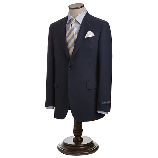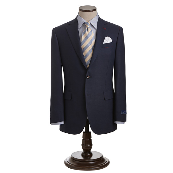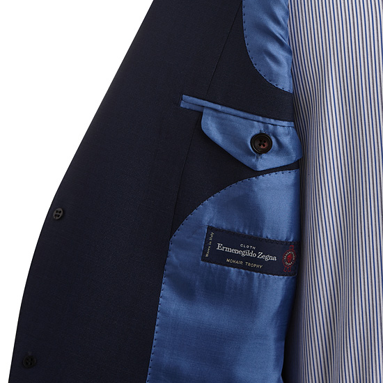 - 블루톤의 마이크로 조직감 원단을 매치한 남성 수트 자켓.