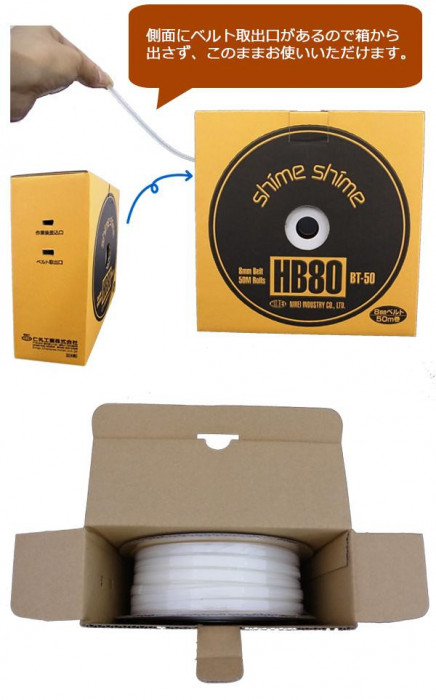 「しめしめ」のベルトは、押出し成形法によって製造されます。押出し成形法によって製造されたベルトは、左右対称にバランスが良く、応力が平均する構造になっているため、寒冷地での(乾燥時)使用にも折れ等が発生しにくくなっています。また、強い破断強度を兼ね備えています。「しめしめ80スペアクリップ」と合わせてご使用ください。 |