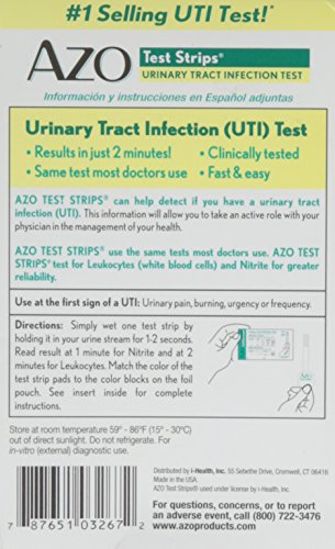 -. Binding : Health and Beauty -. Brand : Azo Naturals -. EAN : 6935743148082 -. Feature : Easy to use / (Accurate) Results in 2 minutes / Clinically tested / Clean Grip Handle / Uses the same tests most doctors use -. IsAdultProduct : 0 -. Label : Everready First Aid -. LegalDisclaimer : * These statements have not been evaluated by the Food and Drug Administration. This product is not intended to diagnose, treat, cure or prevent any disease. ** Always refer to the manufacturer's label on the product for description, recommended dose and precautions. -. Manufacturer : Everready First Aid -. Model : 03267 -. MPN : 787651032672 -. NumberOfItems : 1 -. PackageQuantity : 1 -. PartNumber : 787651032672 -. ProductGroup : Health and Beauty -. ProductTypeName : HEALTH_PERSONAL_CARE -. PublicationDate : 2016-07-28 -. Publisher : Everready First Aid -. ReleaseDate : 2016-07-25 -. Studio : Everready First Aid -. Title : Azo Test Strips, 3 Count -. UPC : 707005062674