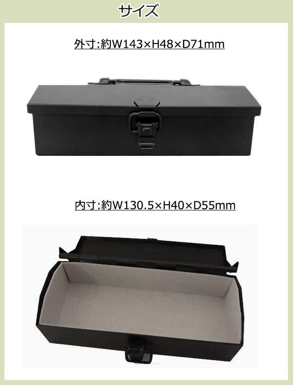 小物入れやアクセサリー収納、筆記具等を入れるのに便利なミニツールボックスです。 製造国:日本 素材・材質:本体:スチール、内部生地:フェルト 商品サイズ:外寸:約W143×H48×D71mm、内寸:約W130.5×H40×D55mm 重量:210g ※サプライヤー直送品【商品名】TOYO 東洋スチール COBAKO ミニサイズのスチールボックス Y-14BK ブラック