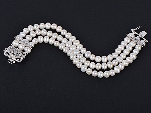 From Mariell's luxe collection, we present this breathtaking triple-strand pearl bracelet featuring Genuine Freshwater Pearls in an heirloom-style Art Deco design. The organic freshwater pearls are varied in size, shape and individual characteristics and come to you exactly as they occur in nature, giving this bracelet its distinctive look of priceless cultured pearls. Our 3-row antique reproduction bracelet boasts meticulous genuine Platinum plated vintage details with AAAAA quality Cubic Zirconia accents. We have crafted this beautiful pearl statement bracelet with an antique reproduction box clasp and safety closure usually found only on genuine diamond and pearl jewelry. This top-selling pearl jewelry is perfect for vintage weddings, special occasions or everyday glamour. With its timeless beauty and classic design, our pearl cuff makes an impressive gift and is a must have for any woman's jewelry collection. Whether accessorizing formal frocks or jazzing up your business wardrobe, you'll make an unforgettable grand entrance wearing this sophisticated estate-quality freshwater accessory. We promise you'll adore this best-selling pearl bracelet or your Money-Back. Treat yourself or someone you love to some ��Downton Abbey" vintage elegance with the look of fine estate jewelry at a fraction of the price! As always, enjoy Mariell's exclusive 100% RISK FREE Purchase and LIFETIME GUARANTEE.Feature