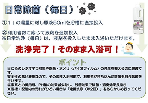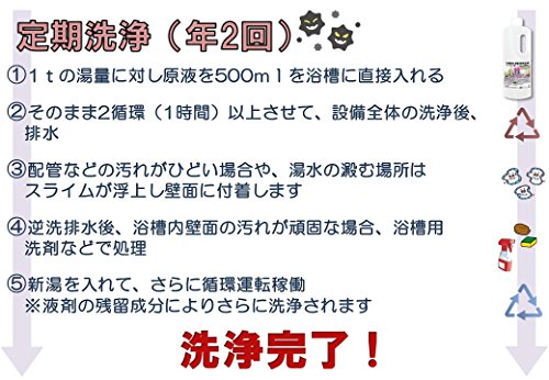 사용 방법(배관 세정 시/연2회):1톤의 수 에 대하고, 본 제품을 욕조 배꼽 그대로 500ml투입하여 1시간~2시간 순환 운전을 합니다.제균후에 잡균이 포편지에서 분해되어 욕조에 방출되는 때문에,헹궈 완료입니다.