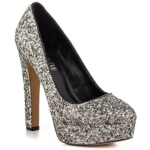 Almond-toe pump featuring in allover glittery sequins featuring chunky platform and heel