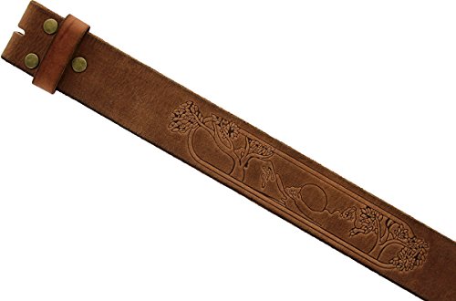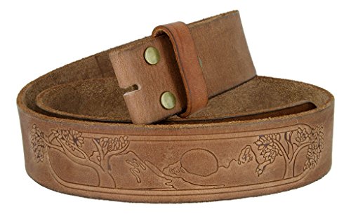 -. Binding : Apparel -. Brand : Belts.com -. Color : Brown -. Department : mens -. Feature : 100% Full Grain Leather / Natural 100% Leather-No dyes, paper, or any synthetic material- with matching color leather loop / Outdoors nature Theme hand tooled down the center of the belt / 1.75"(45mm) wide with a snap system to interchange buckles / Meaure around where you wear the belt, with your pants on, and order that size -. ProductGroup : Apparel -. ProductTypeName : ACCESSORY -. Title : Tree of Life Casual Jean Natural Full Grain Leather Belt Strap for Men