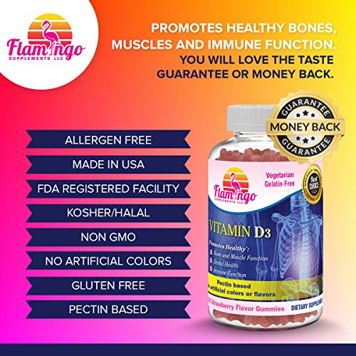 -. Feature : THE BEST WAY TO TAKE YOUR VITAMIN D GUARANTEED. Our natural, vitamin D3 gummies have a whopping 800 IU per serving and we guarantee you will love the taste or your money back. The best part is, these gummies are vegetarian, kosher, halal and have no gross ingredients like gelatin and are completely GMO-free. / QUALITY VITAMIN D GUMMY. Flamingo Supplement's believes in the highest quality. Packed with 200% (400 IU per gummy) of your Vitamin D daily values, our strawberry gummies are tastier and more enjoyable than pills, sprays, drops or liquids. Our gummies are made in the USA in a FDA-approved facility that is GMP compliant. / PERFECT VITAMIN D3 FOR KIDS WOMEN AND MEN. Vitamin D is essential to building strong, healthy bones, beautiful teeth, and leaner muscles in men, women, and children of all ages. This gummy supplement contains NO gluten, wheat, peanuts, soy, eggs, fish, shellfish. Just pop 2 chewable gummies (one serving) daily after breakfast and you are good to go. / PHYSICAL & EMOTIONAL HEALTH - Studies show that taking Vitamin D regularly can boost your immune system and help reduce depression symp. / WE GUARANTEE SAFETY AND SATISFICATION. If you are unhappy with these gummies for any reason, go ahead and return them for 100% money back. Flamingo Supplements is a leader in the gummy industry specializing in gummies for kids and adults alike with high quality ingredients. We use clean ingredients like pectin and keep our formulations as simple as possible.