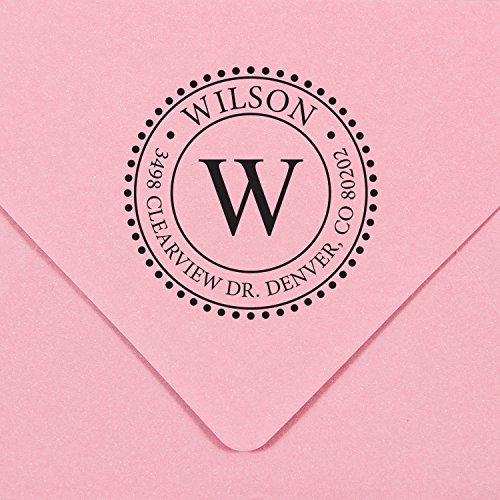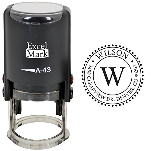 -. Feature : A custom self inking monogram address stamp personalized with your name and address in the font and style shown / Self-inking design allows for rapid, repetitive stamping / Sturdy stamp mount features an open base to easily align impressions / Round impression area: 1-5/8" diameter / Available in your choice of the following ink colors: black, red, blue, green, purple or brown