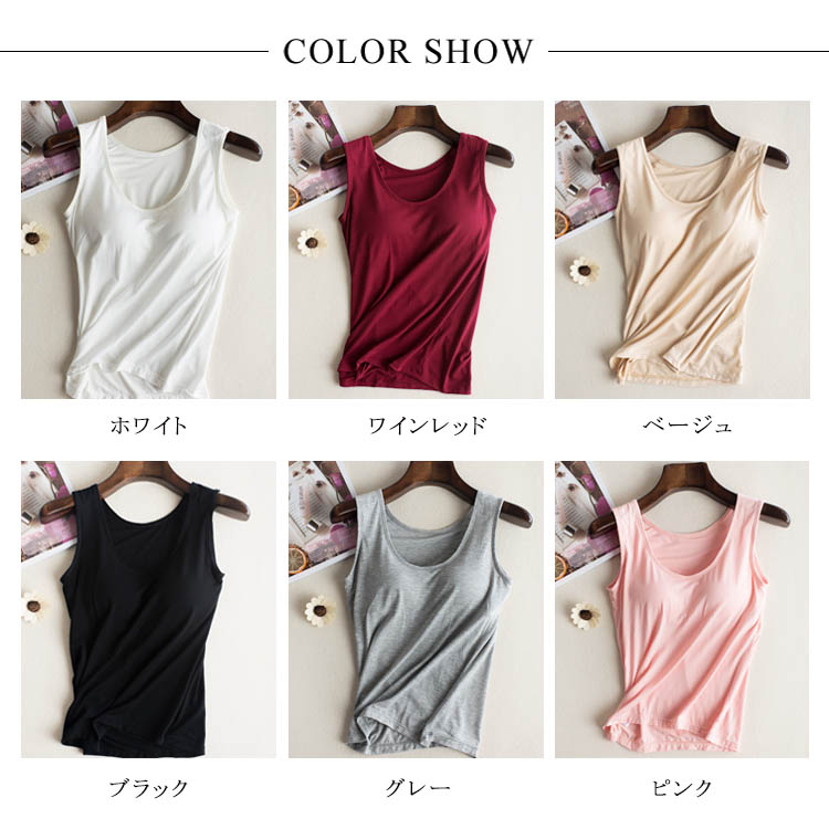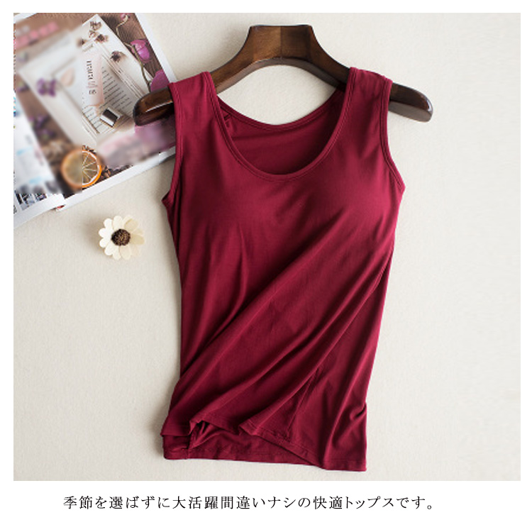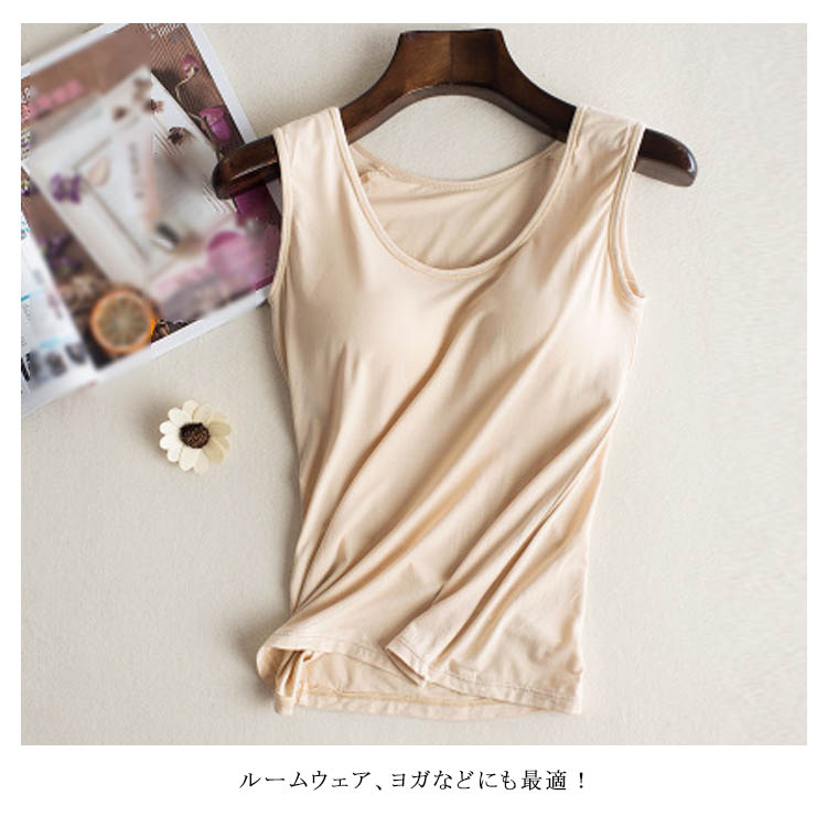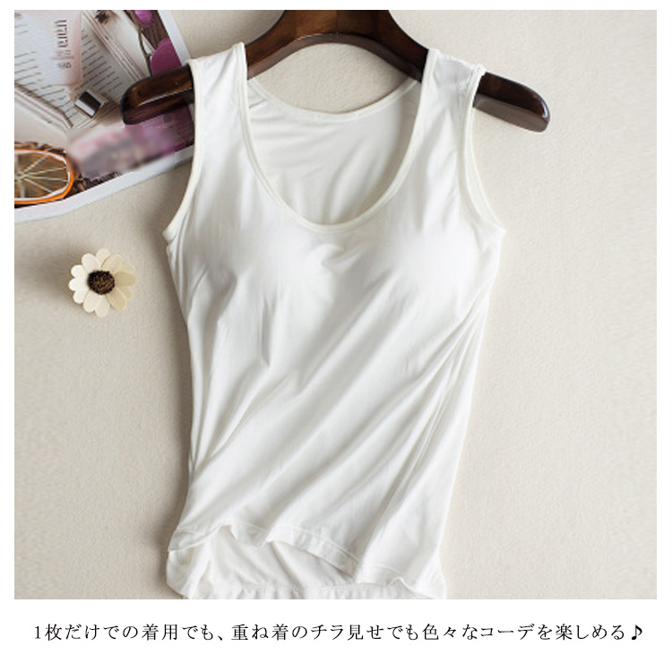| きれいな丸胸が作れる、しっかりした素材のカップ付タンクトップ。アンダー部分はゴムが1周し、内側布が全体を支える構造。動いてもカップがずれにくくなっています。1枚だけでの着用でも、重ね着のチラ見せでも色々なコーデを楽しめる♪季節を選ばずに大活躍間違いナシの快適トップスです。ルームウェア、ヨガなどにも最適! | |