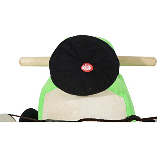 Specifications: - Overall Dimensions: 23.6"L x 13"W x 17.7"H - Base Size: 23.6"L x 12.8"W - Seat Height: 9.8" - Net Weight: 5.5lbs - Weight Capacity: 132.3lbs - Material: Plush, Wood - Color: Green - Recommend Age: 18 months and up - Uses 3 LR44 batteries (included) Note: Please ensure that your child meets all size criteria. 0