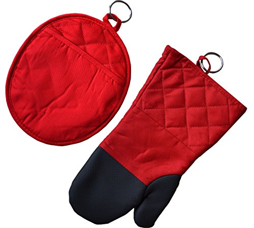 - • Set includes 1 Oven mitt 13"x 7” and 1 Potholder 10” x 7.5”. • Material: 100% cotton + Neoprene outer layer. • Neoprene heat resistant up to 500 F, the textured nonslip surface offer durable grip on pots, pans, dishes, casserole dishes and more • The 2 in 1 pot holder comes with side pocket and neoprene layer used as pot holder and additional glove.