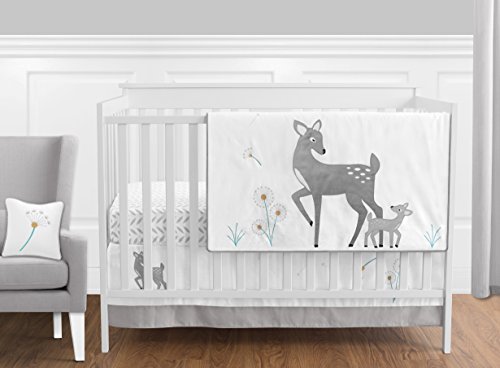 -. Feature : 11 Piece Set Includes: (1)Crib Blanket, (3)Wall Hangings, (1)Fitted Sheet, (1)Skirt, (2)Window Valances, (1)Diaper Stacker, (1)Toy Bag and (1)Throw Pillow / **Sweet Jojo Designs also offers matching bumper sold separately and a 9 piece set that includes the bumper / This bedding set features detailed appliqué and embroidery works of frolicking deer and delicate dandelions with a grey and white geometric leaf P.R.Int / This set is made of soft 100% cotton and microsuede and is machine washable / This design has matching accessories such as hampers, lamp shades, window treatments and wall decor